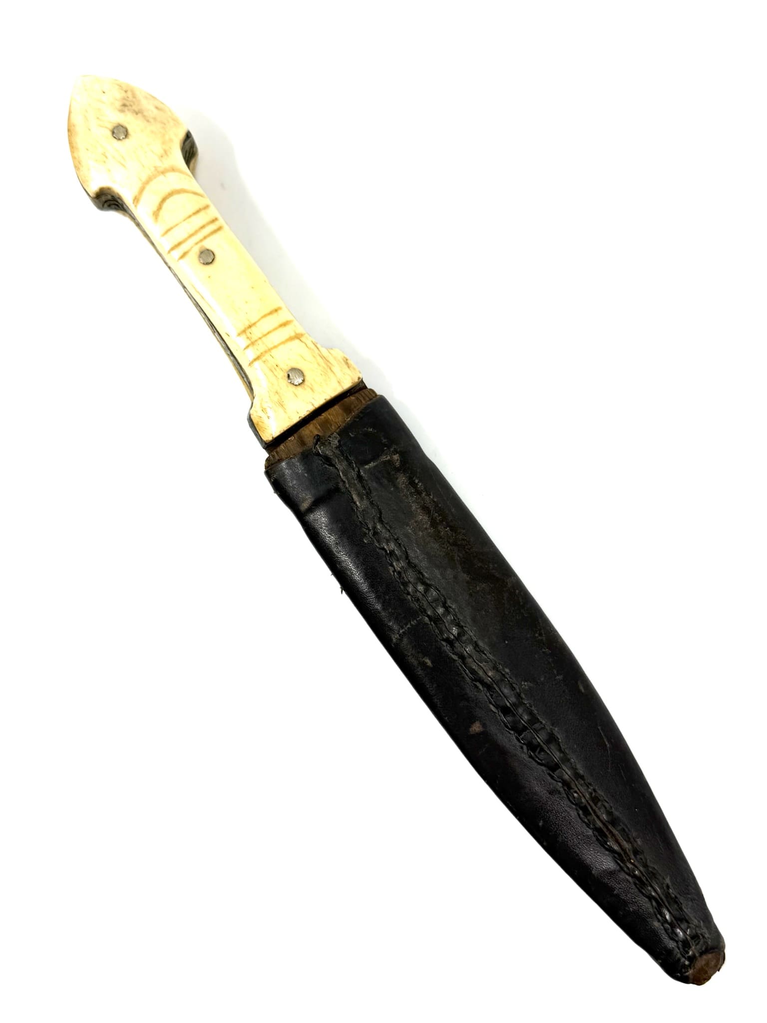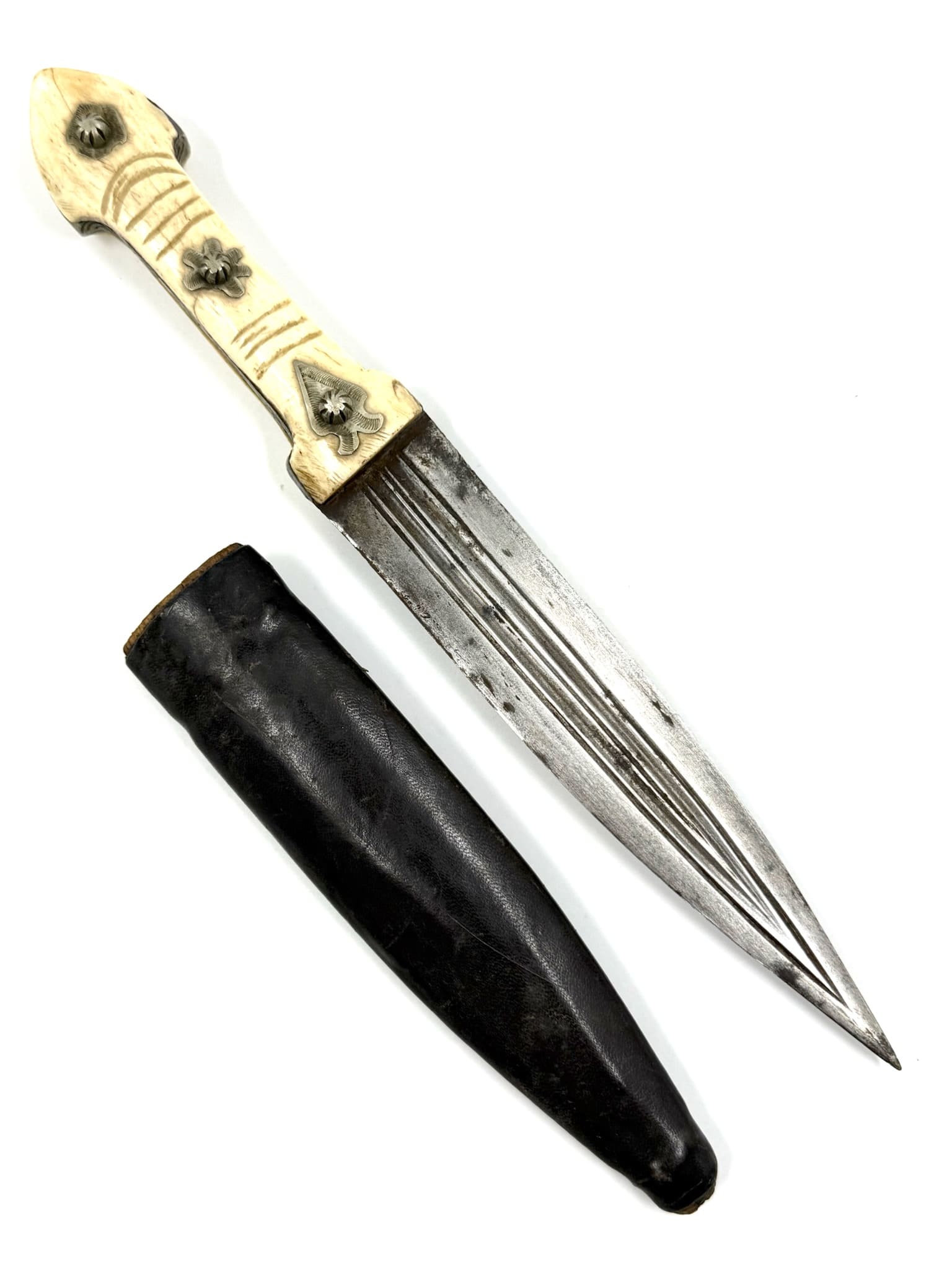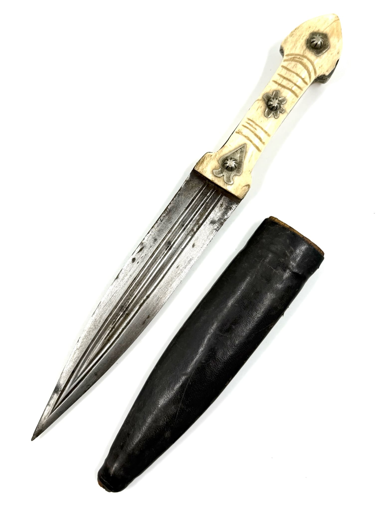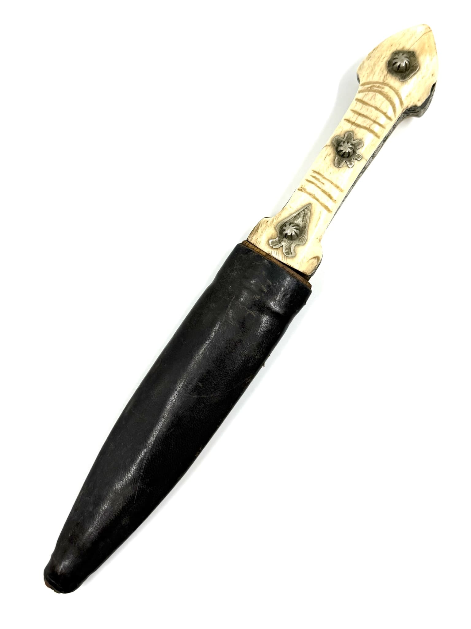 Kinjal με λαβή από κόκκαλο διακοσμημένη με ασημένια στοιχεία και δερμάτινη θήκη.