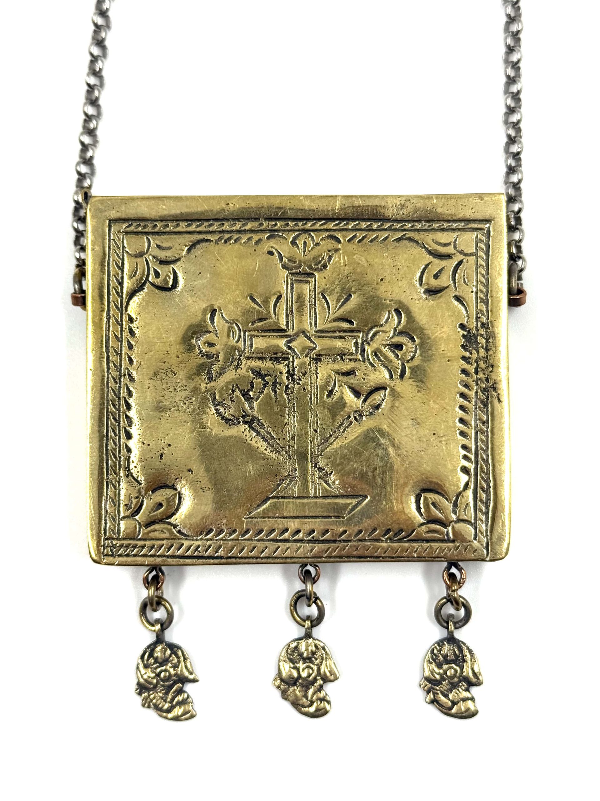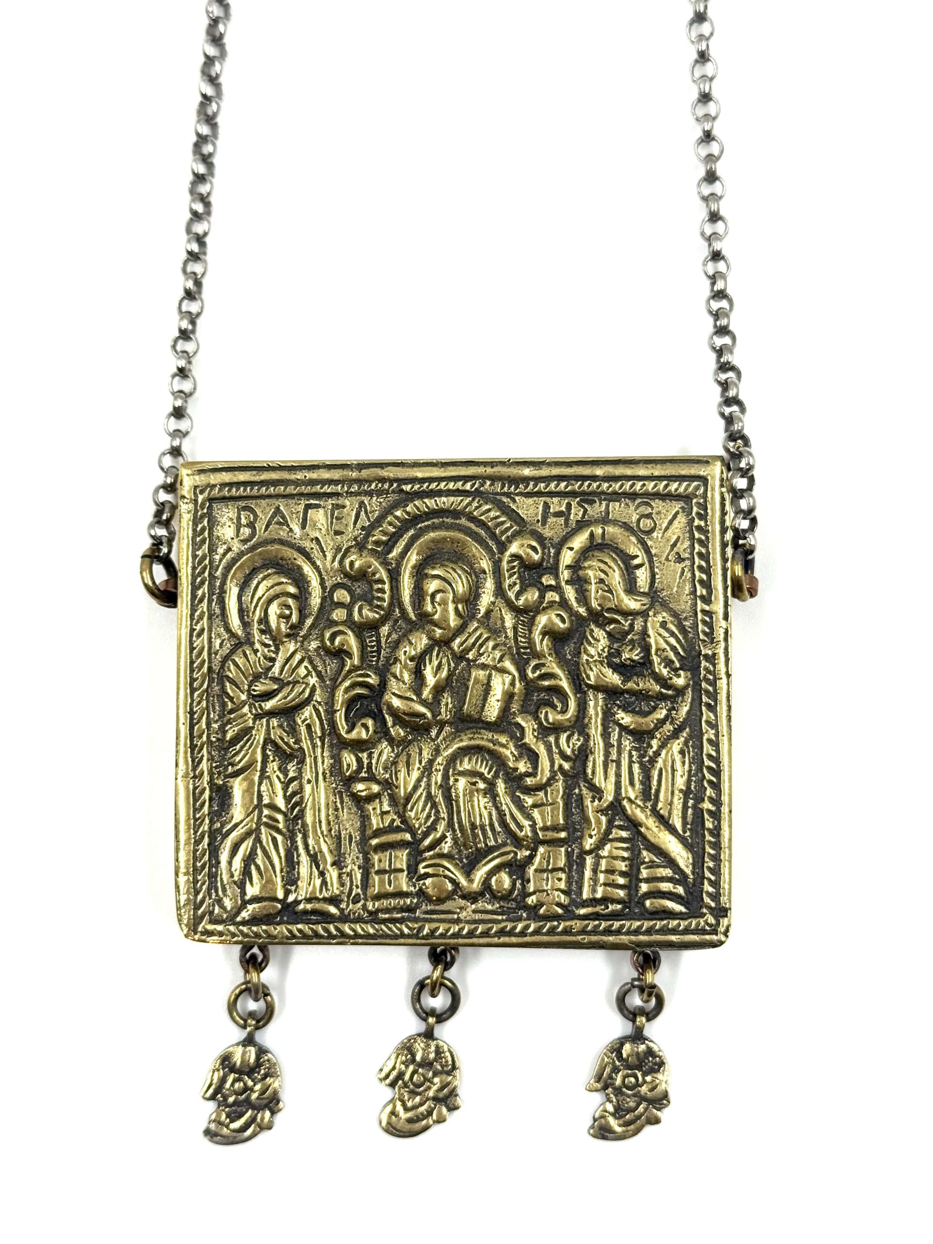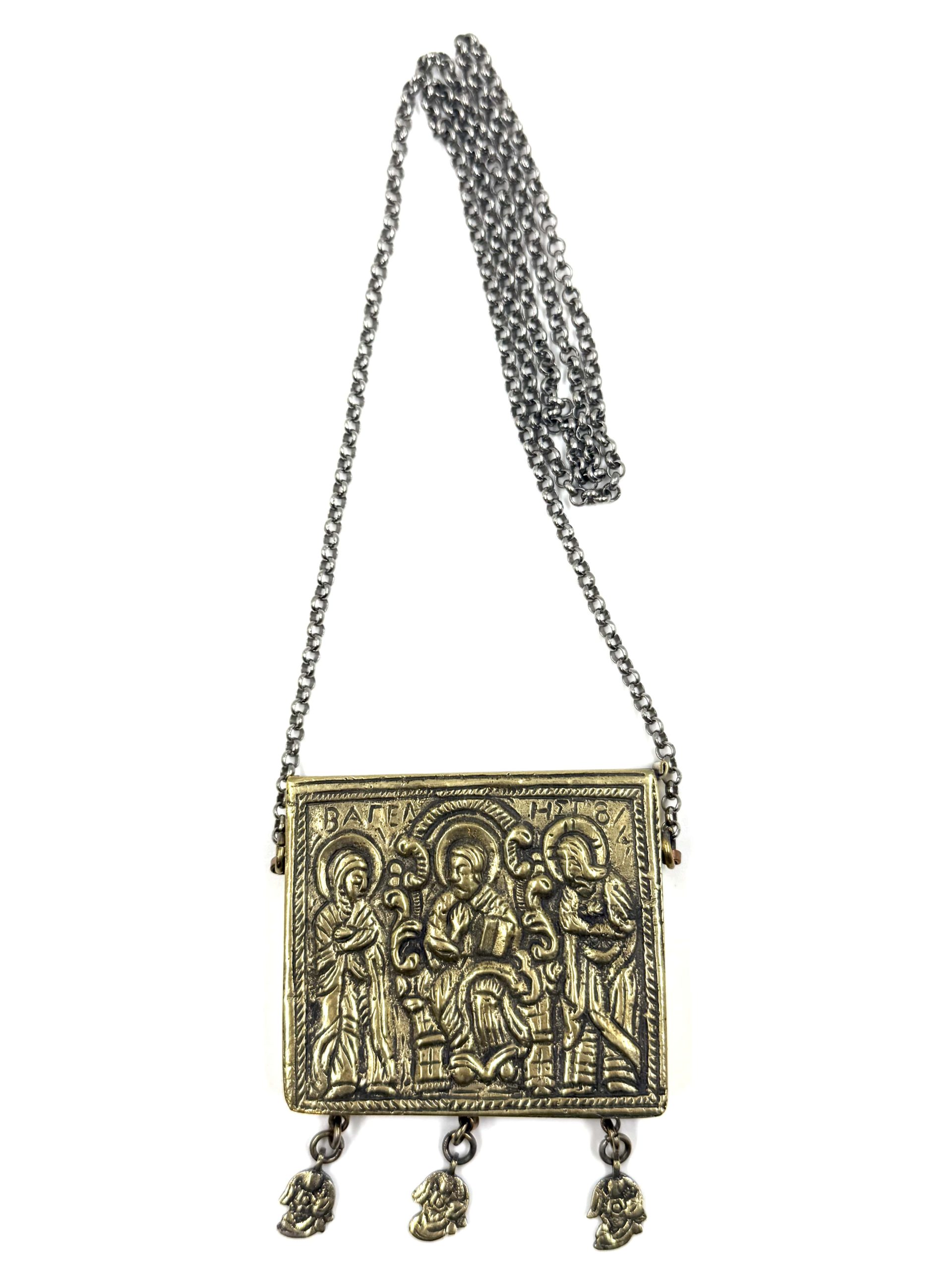 Μεταγενέστερο μπρούτζινο φυλαχτό με θρησκευτική παράσταση και σταυρό στην πίσω πλευρά.
