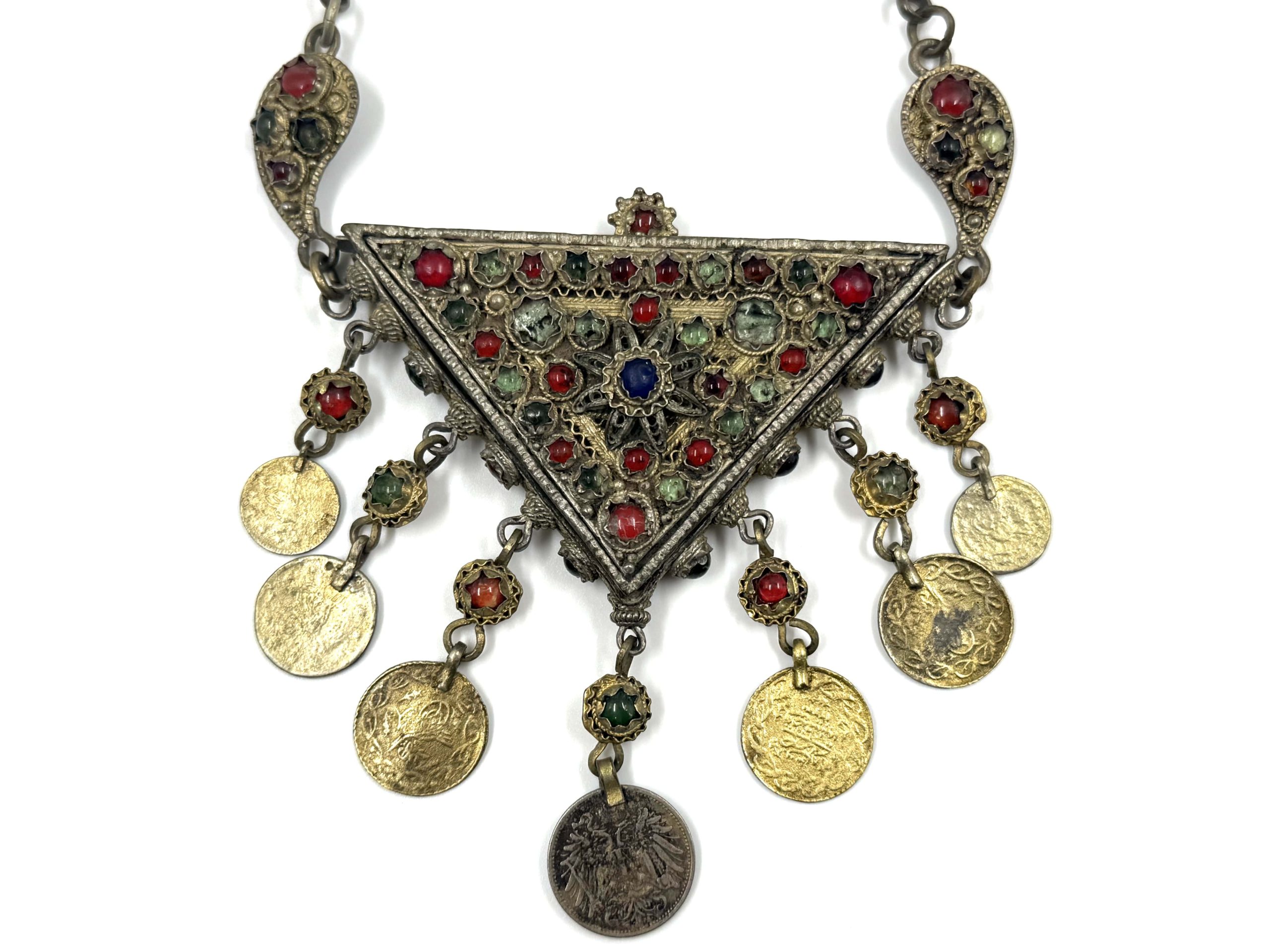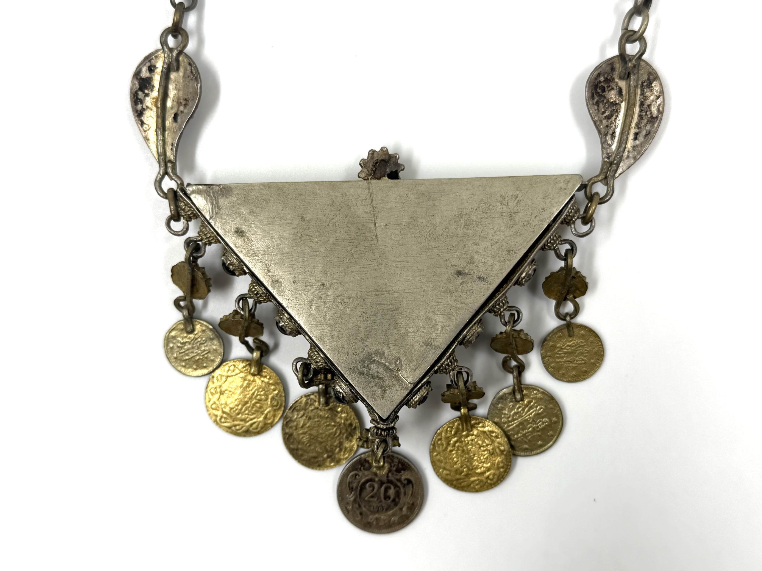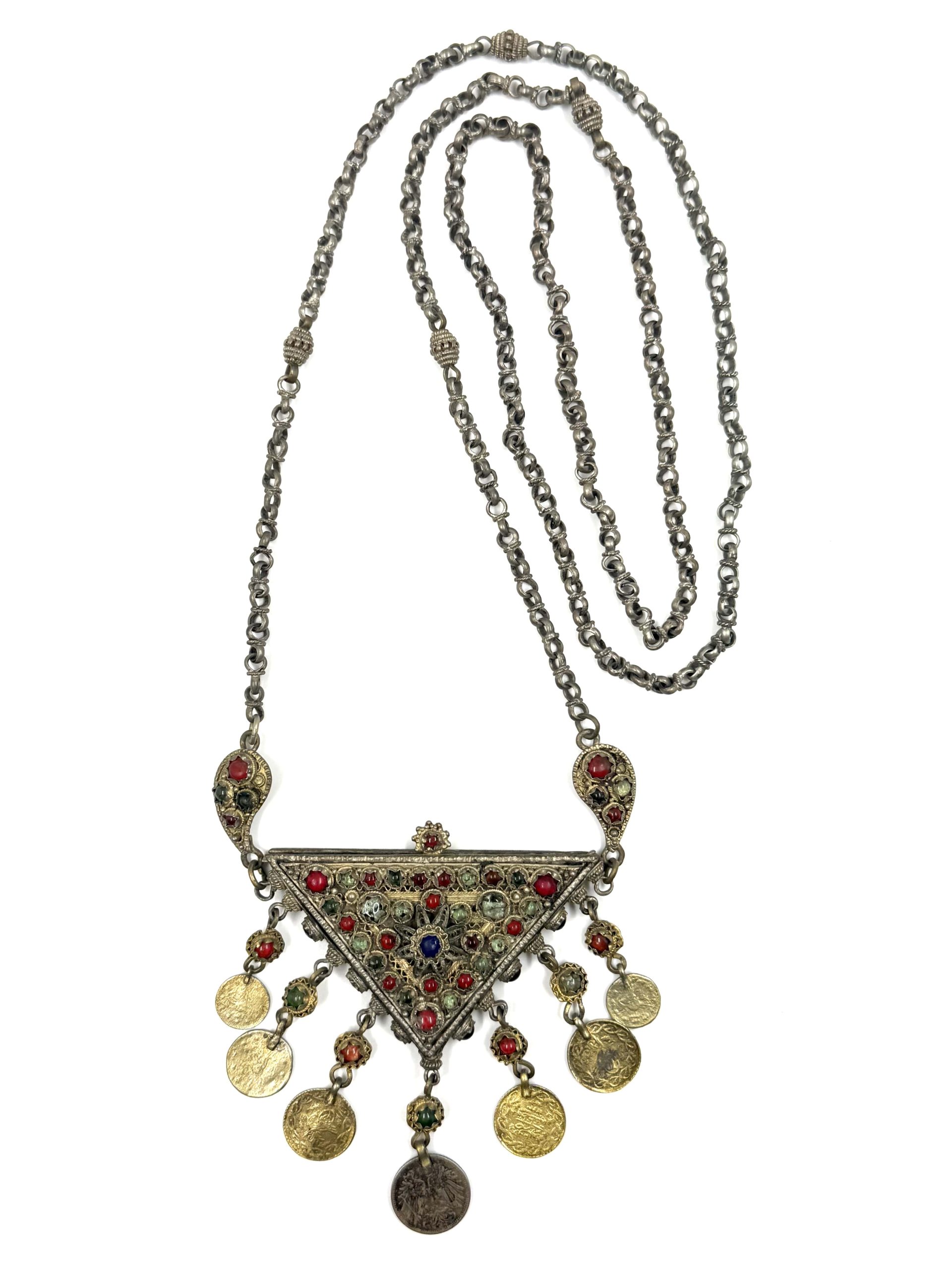 Ασημένιο παραδοσιακό τριγωνικό φυλαχτό με την ασημένια αλυσίδα του, διακοσμημένο με πέτρες.
